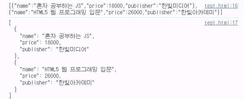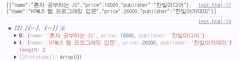 → JSON 문자열을 자바스크립트 객체로 전개할 때는 JSON.parse( ) 메소드 사용